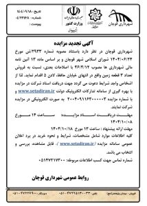 شهرداری قوچان در نظر دارد باستناد مصوبه شماره 2933/ش مورخ 24/06/1404 شورای اسلامی شهر قوچان و بر اساس ماده 13 آئین نامه مالی شهرداری ها مصوب 12/4/46 با اصلاحات بعدی، نسبت به فروش تعداد 3 قطعه زمین واقع در انتهای خیابان حافظ، لادن 5 اقدام نماید. لذا از اشخاص واجد شرایط دعوت می گردد جهت دریافت اسناد شرکت در مزایده با بهره گیری از سامانه تدارکات الکترونیک دولت www.setadiran.ir و با شماره مزایده 2004091163000003 به صورت الکترونیکی در مزایده شرکت نمایند.