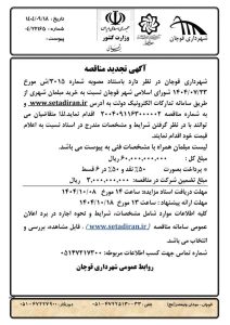 شهرداری قوچان در نظر دارد باستناد مصوبه شماره 3015/ش مورخ 23/07/1404 شورای اسلامی شهر قوچان نسبت به خرید مبلمان شهری از طریق سامانه تدارکات الکترونیک دولت به آدرس www.setadiran.ir و به شماره مناقصه 2004091163000002 اقدام نماید.لذا متقاضیان می توانند با در نظر گرفتن شرایط و مشخصات مندرج در اسناد نسبت به اعلام قیمت خود اقدام نمایند.