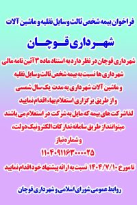 فراخوان بیمه شخص ثالث وسایل نقلیه و ماشین آلات شهرداری قوچان شهرداری قوچان در نظر دارد به استناد ماده ۳ آئین نامه مالی شهرداریها نسبت به بیمه شخص ثالث وسایل نقلیه و ماشین آلات شهرداری به مدت یک سال شمسی و از طریق برگزاری استعلام بهاء اقدام نمایید لذا شرکتهای بیمه که مایل به شرکت در استعلام می باشند میتوانند از طریق سامانه تدارکات الکترونیک دولت و شماره نیاز ۱۱۰۴۰۹۱۱۶۳۰۰۰۰۲۵ تا مورخ ۱۴۰۴/۷/۱۰ نسبت به ارائه پیشنهاد خود اقدام نمایید روابط عمومی شورای اسلامی و شهرداری قوچان